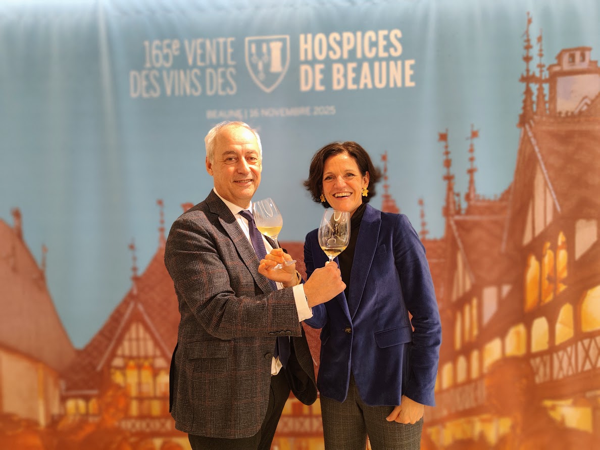 - Ludivine Griveau régisseur du Domaine viticole des Hospices et Albéric Bichot de la Maison Albert Bichot qui s’illustre depuis 26 ans comme 1er acheteur de ces ventes. Photo © François Collombet