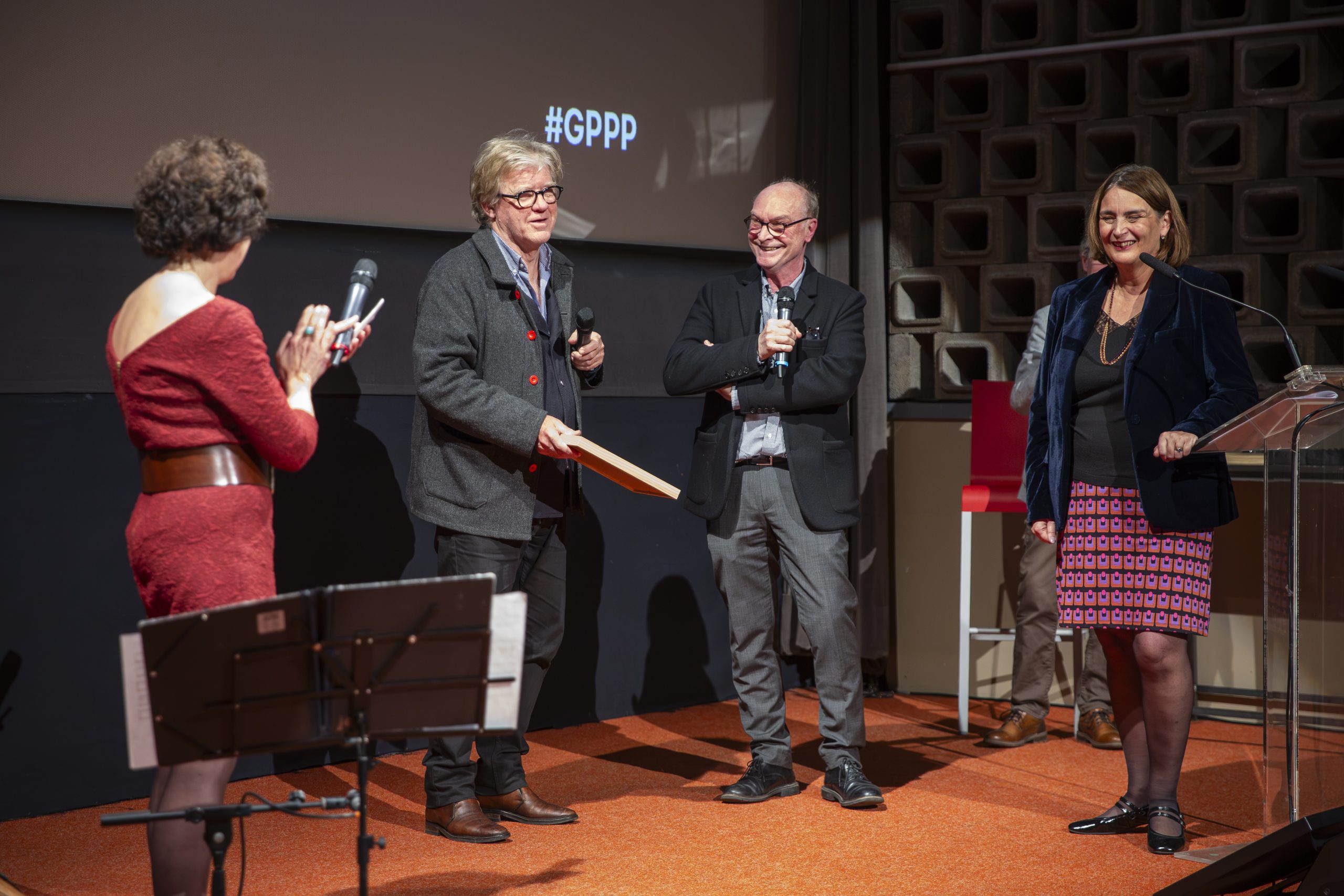 - La remise du prix à Eric Audinet, fondateur et directeur de Confluences. De g à dte : Catherine Lalanne, Eric audinet, Philippe Royer et Sophie Laurant © Louise Allavoine / Le Pèlerin.