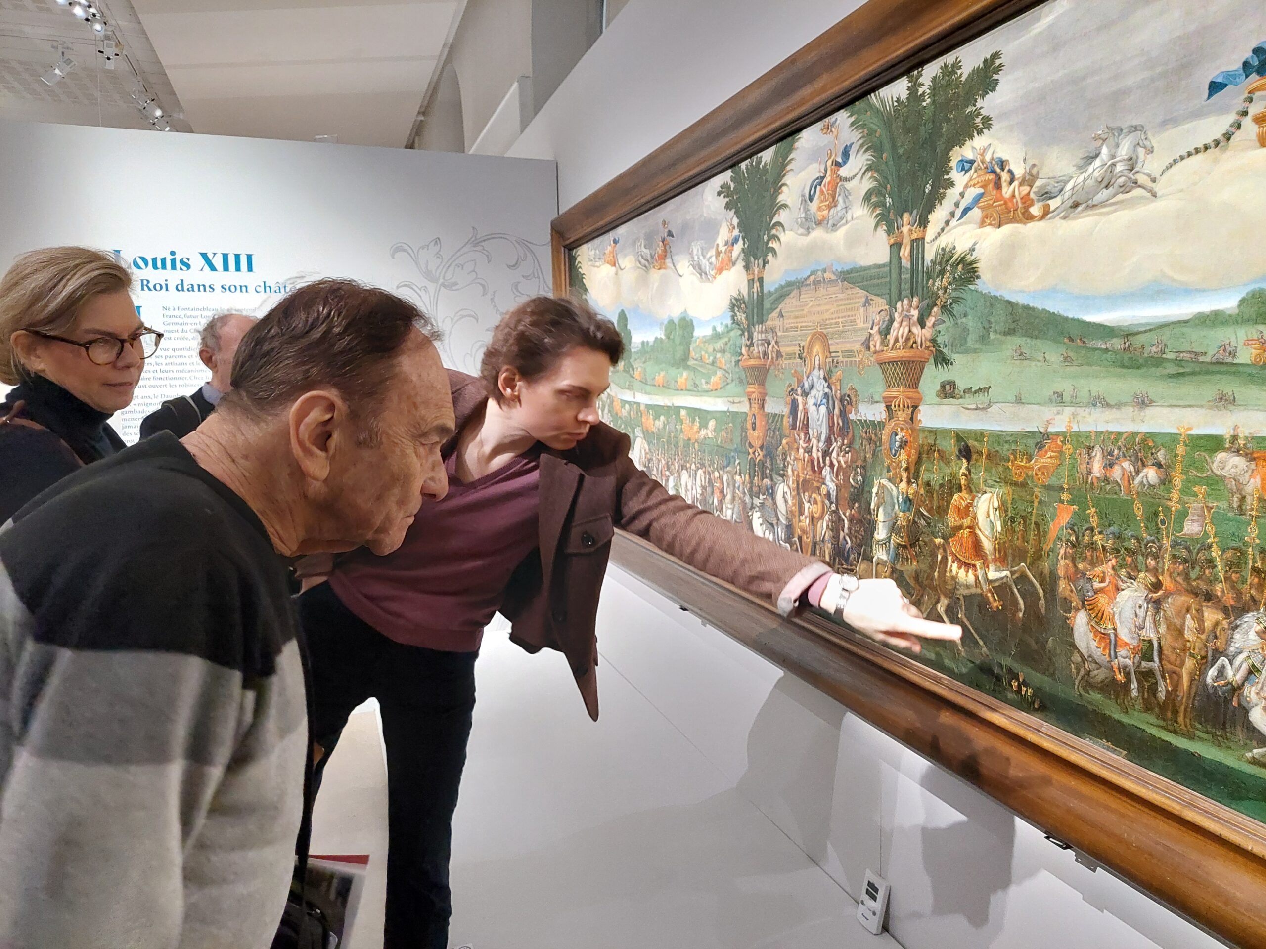 - Alexandra Zvereva, directrice du musée Ducastel-Vera, responsable des collections patrimoniales de Saint-Germain-en-Laye, détaille une toile de Claude Deruet, La Terre ou le Triomphe d’Anne d’Autriche, 1640, prêtée par le musée des Beaux-Arts d’Orléans. L’œuvre a pour fond le Château-Neuf (photo Philippe Royer)