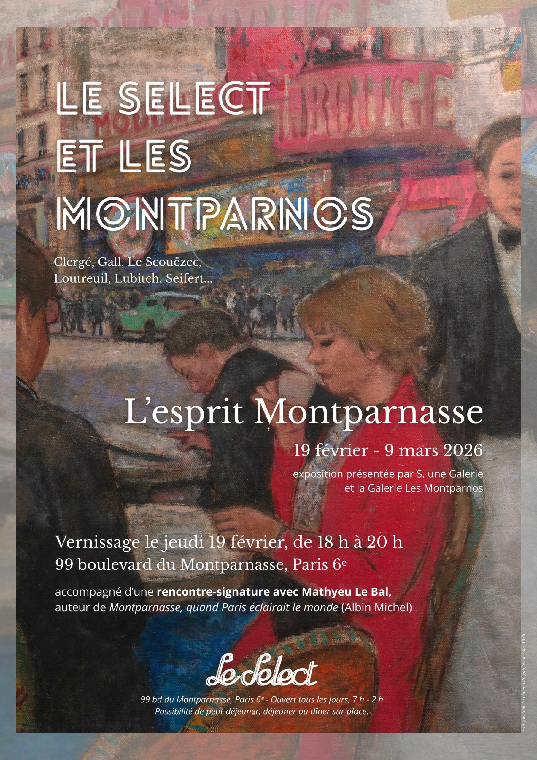 Marie-Lize Gall, membre et amie de longue date de l’AJP, nous convie au vernissage de l’exposition L’Esprit Montparnasse, le 19 février, entre 18h et 20h, au Select, 99, boulevard Montparnasse.