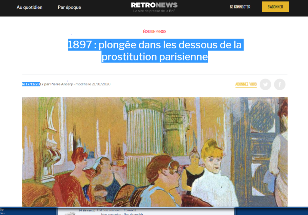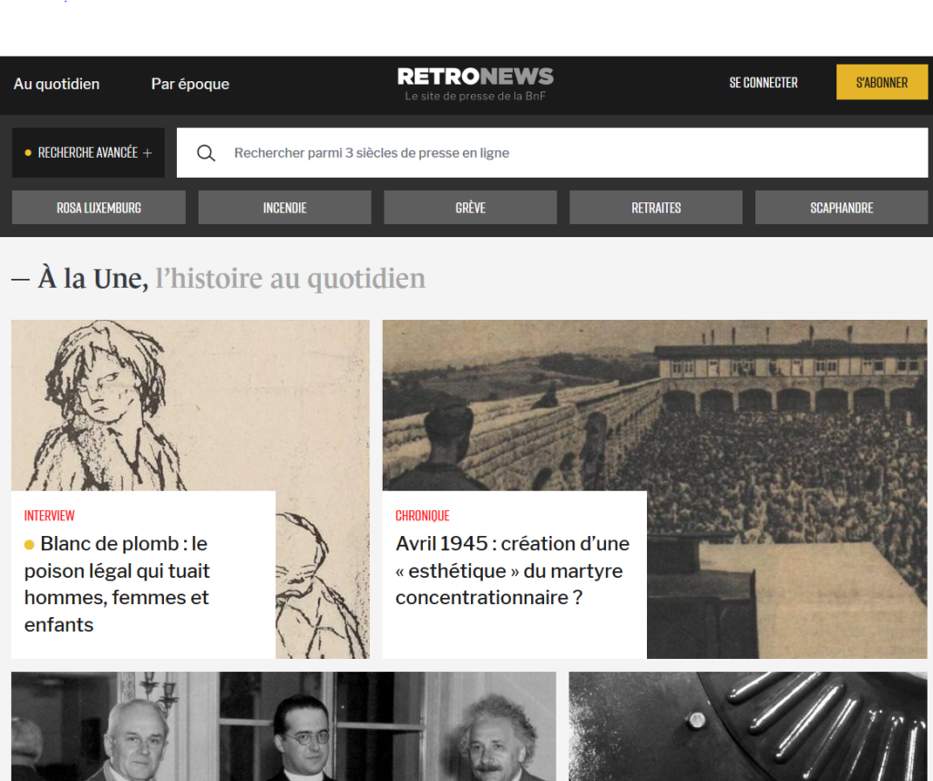 Par ailleurs, Retronews est un média, un site d’histoire vue par la presse avec une équipe de journalistes et d’universitaires qui utilise cette matière d’archives pour en faire des articles de vulgarisation à destination de tous. Pour l’instant, nos confrères ont écrits plus de 2000 articles (véritables dossiers appelés « Longs formats » ou courts focus « échos de presse » ) autour de 300 événements historiques. Ces contenus éditoriaux sont en partie gratuits, en partie accessible par abonnement (autour de 9, 75€ par mois). De courtes vidéos sont aussi être réalisées. Comme celle-ci concernant le duel de Marcel Proust .