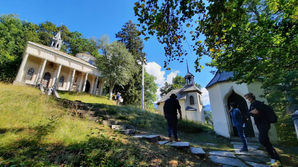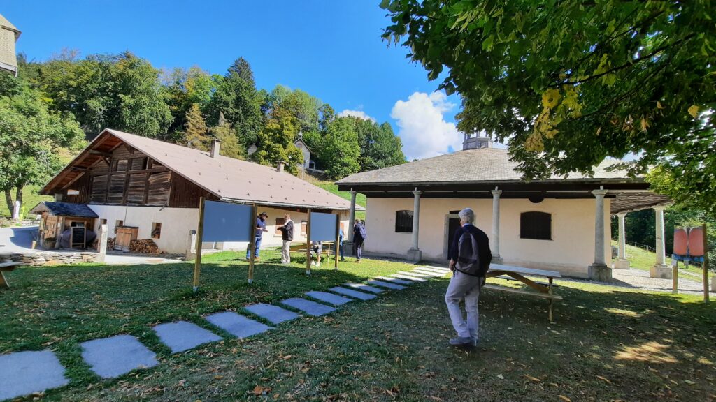 Le voyage a commencé par la découverte de la place centrale de la mairie désertée des touristes. L’accueil de Sylvain Hebel s’est fait au pied du magasin d’Ambroise Allard, concepteur avec Emile Allais et fabricant du célèbre fuseau de ski. Toujours piloté par Sylviane Serraudie, le groupe a attaqué la montée du Golgotha mégevan. Ce Calvaire fût érigé de 1840 à 1885 sur le modèle du célèbre Mont Sacré de Varallo et a été inscrit à l’inventaire des Monuments historiques en 1988 ainsi qu’à l’inventaire européen des Monts Sacrés.