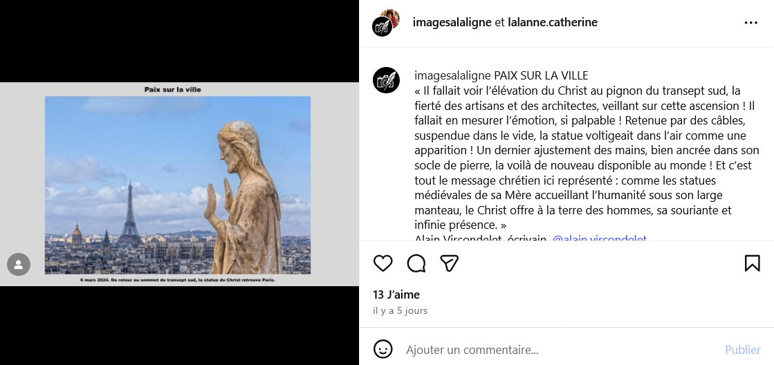Notre consœur Catherine Lalanne vient d’ouvrir un compte Instagram, @imagesalaligne, dédié, ce mois de décembre, au premier anniversaire de la réouverture de Notre-Dame de Paris.