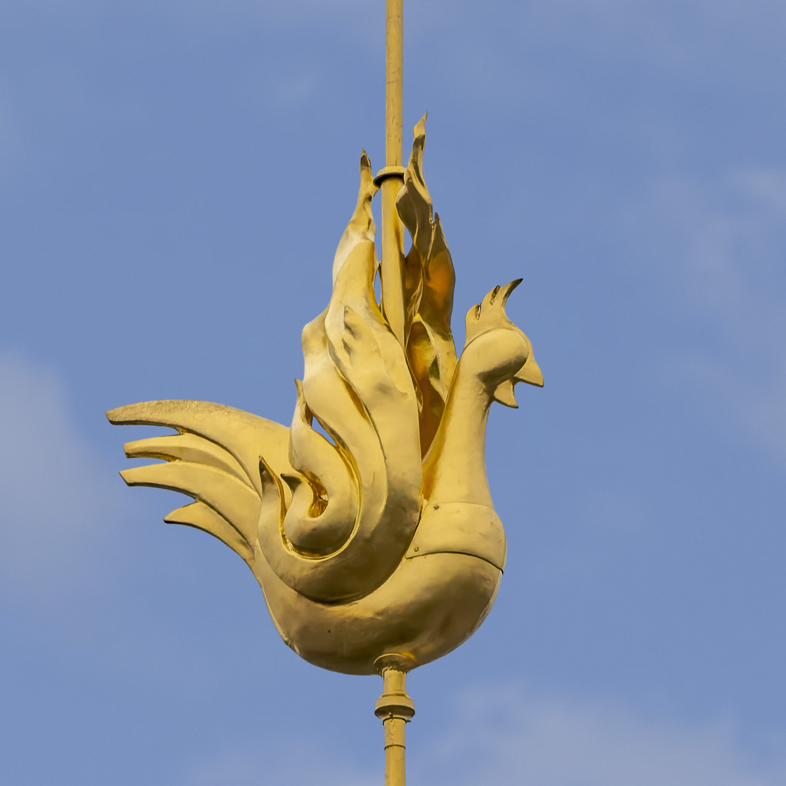 - Cathédrale Notre Dame de Paris. Tout en haut de la flèche, à 96 mètres de hauteur, le nouveau coq girouette dessiné par l’architecte en chef Philippe Villeneuve et posé le 16 novembre 2023 (© Stéphane Compoint)